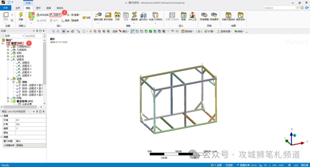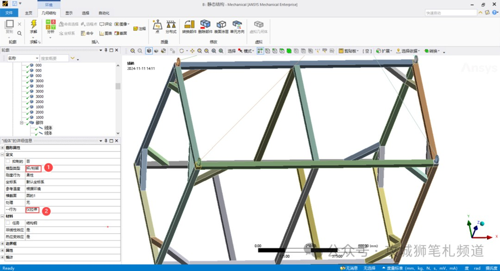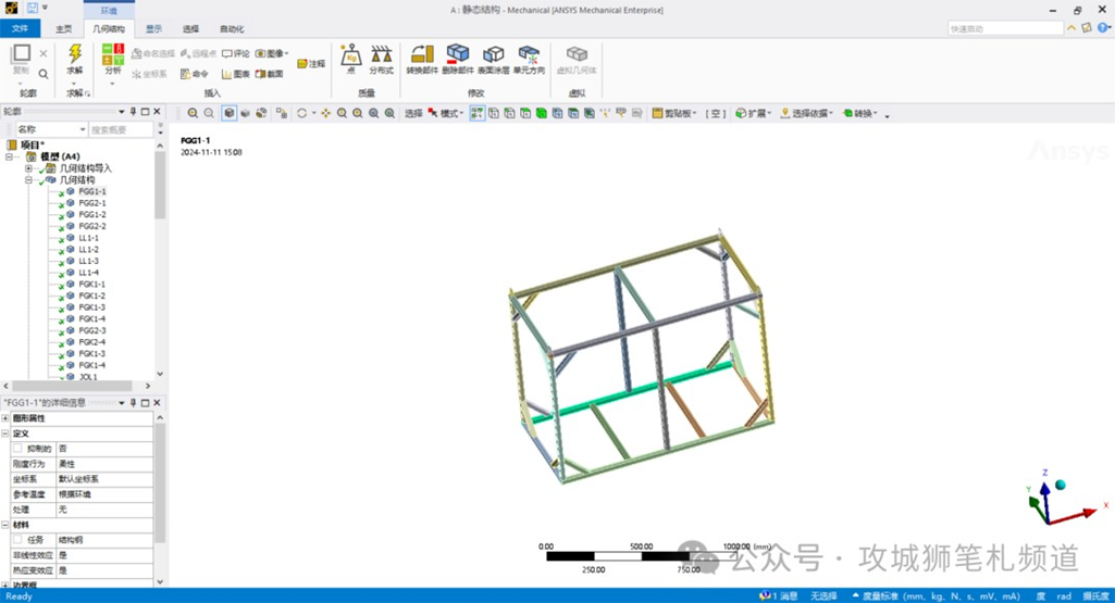 展开几何结构 +——点击第一个元件——在详细信息栏——材料栏 “任务” 选项——选择结构钢。