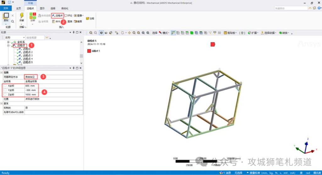 1)单击静态结构 A5,对远端点 5 施加远端位移。环境——结构——支撑——远端位移,选择远程点 5。限制平动自由度。