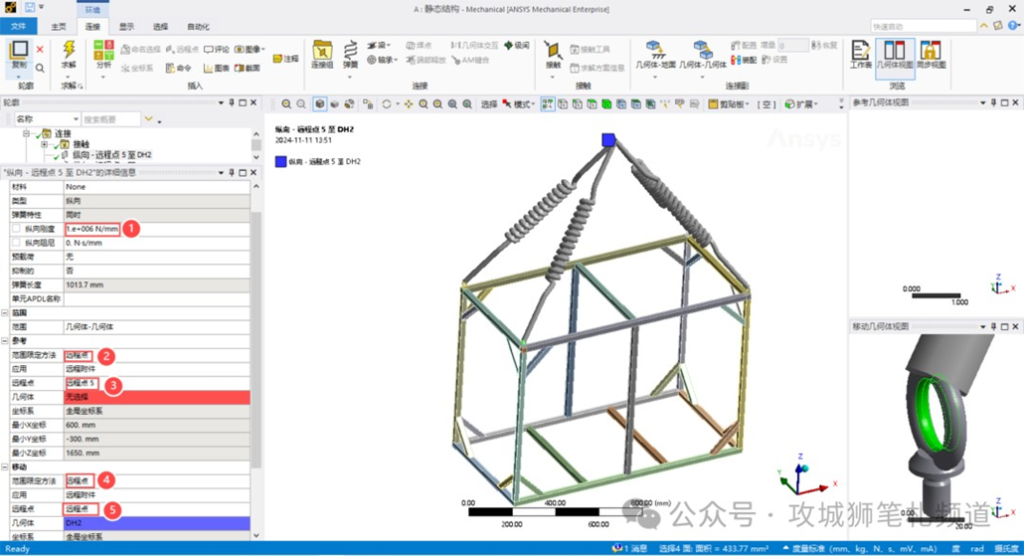 设置弹簧参数。纵向刚度尽可能大点;范围限定方法选远程点。分别将吊点与吊耳连接起来。
