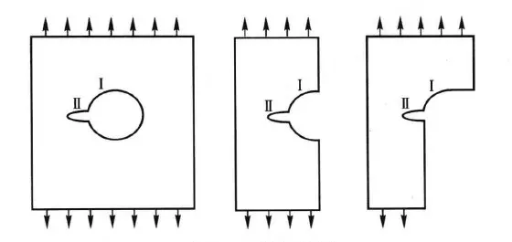 重复缺口效应是指,两个或两个以上的应力集中因素互相重叠而使应力集中进一步加剧的现象,如图 1 所示。如果应力集中因素 Ⅱ 的作用远小于应力集中因素 Ⅰ 的作用,则二重应力集中因素 KⅠ,Ⅱ=KⅠKⅡ;如果应力集中因素 Ⅱ 的作用远超过应力集中系数 Ⅰ,则缺口效应主要取决于应力集中因素 Ⅱ。