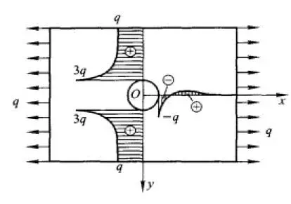 关于矩形板、圆形开孔的孔边应力集成程度与距离圆孔中心远近的关系,即一矩形薄板,在离开边界较远处有半径为 a 的小圆孔,左右两侧受局部拉力,集度(内应力)为 q,通过分析得出,应力在孔边 (ρ=a) 是无孔时的 3 倍;ρ=2a 时为 1.22q;ρ=3a 时为 1.07q;ρ=4a 时为 1.04q。