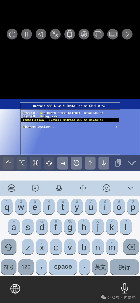 - 启动后,在启动菜单中选择 “Install Android-x86 to harddisk” 来开始安装流程。