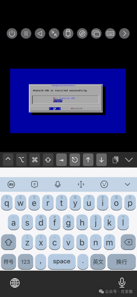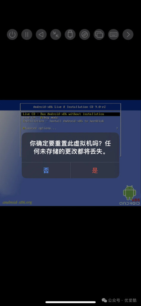 - 当屏幕显示安装成功的信息时,说明安装已经完成。弹出安装 iso 、重置虚拟机 运行 Android x86,或者重启计算机正常启动它。
