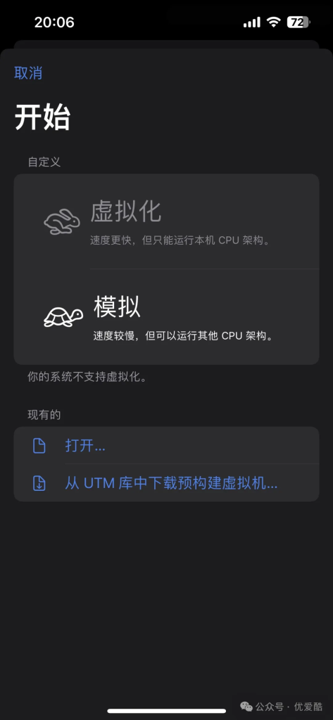打开 UTM 应用后,点击界面上的 “+” 号创建新虚拟机。点击 “模拟” 这一功能,选择 “其它” 可以有更多自定义选项。
