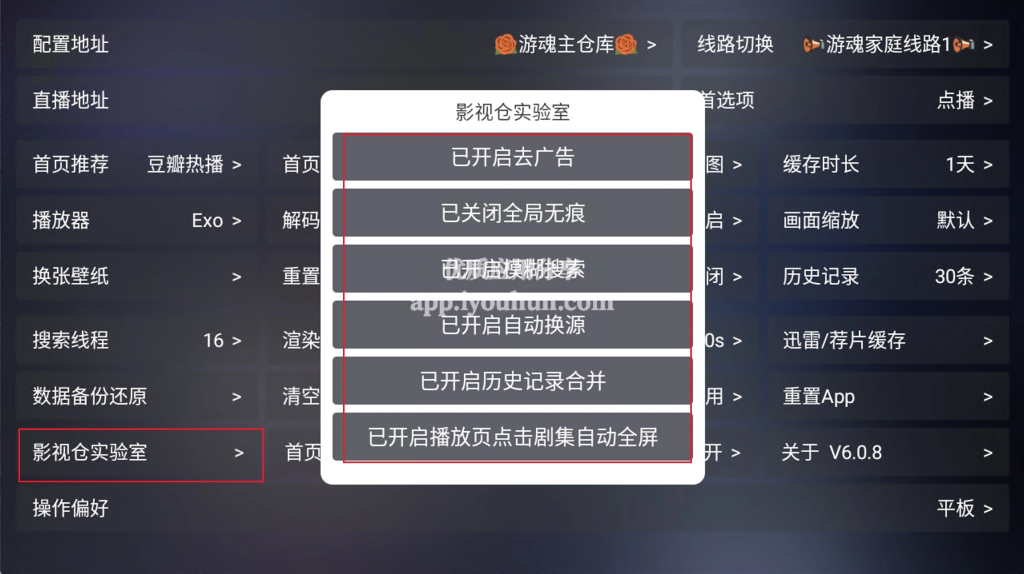 整体设置和 TVBox 非常相似,这里主要说下影视仓实验室和弹幕。如图,都是字面意思,就不过多介绍了。