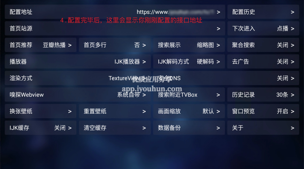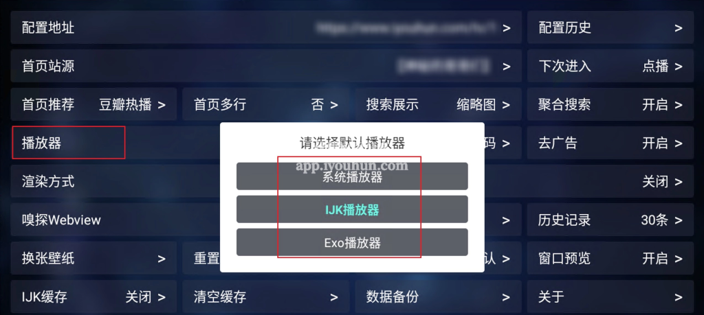 5. 播放器,tvbox默认ijk,推荐EXO画质更好一些,有些设备如果选择系统播放会出现黑屏没有画面,修改一下播放器就行,自己可以测试一下。